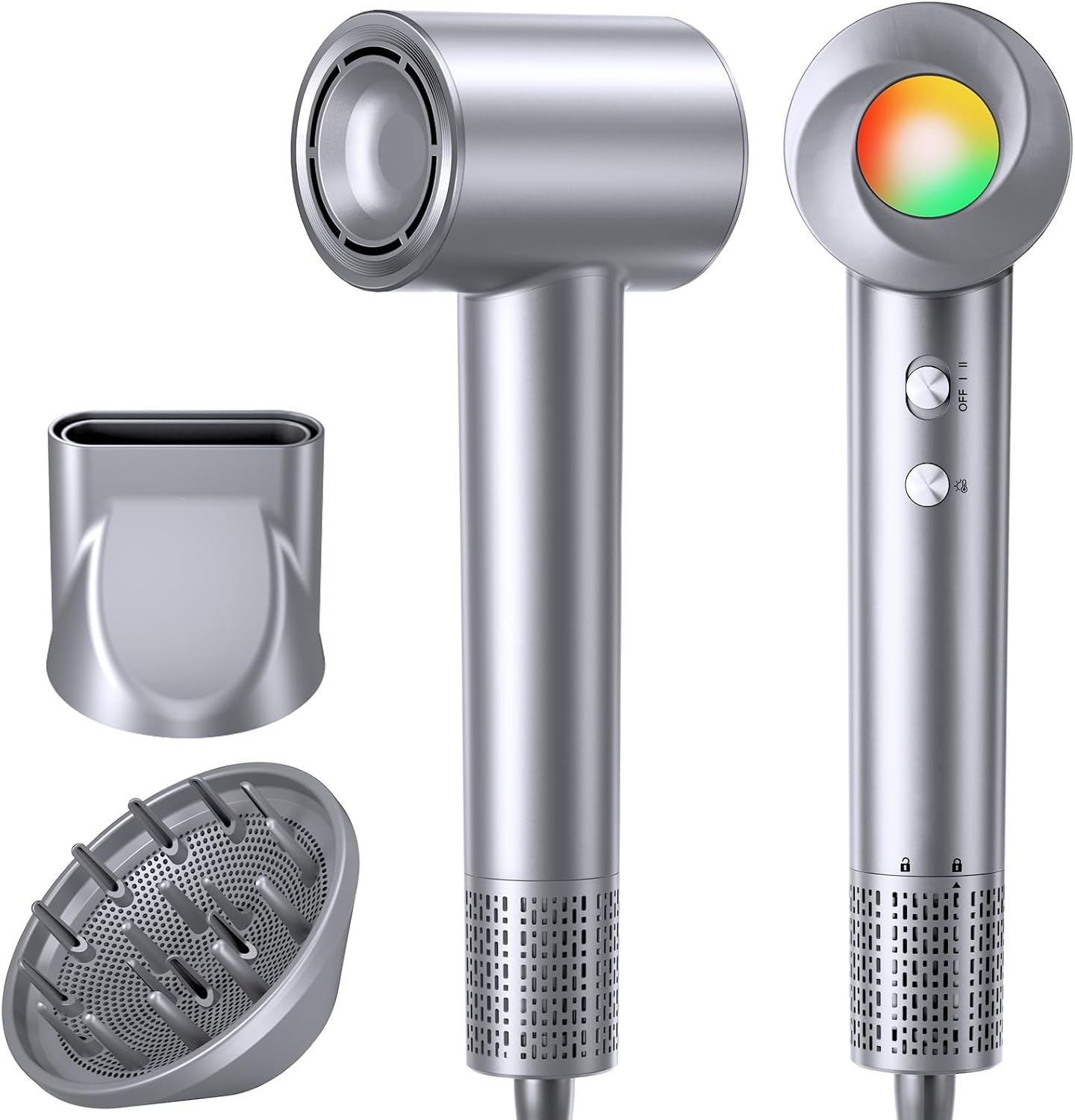 High-Speed Hair Dryer Brushless Motor Ionic, Foldable and Portable 9Modes One Touch Switch with 1Diffuser, 1Nozzle and 1Concentrator Attachment for Home, Travel, Grey